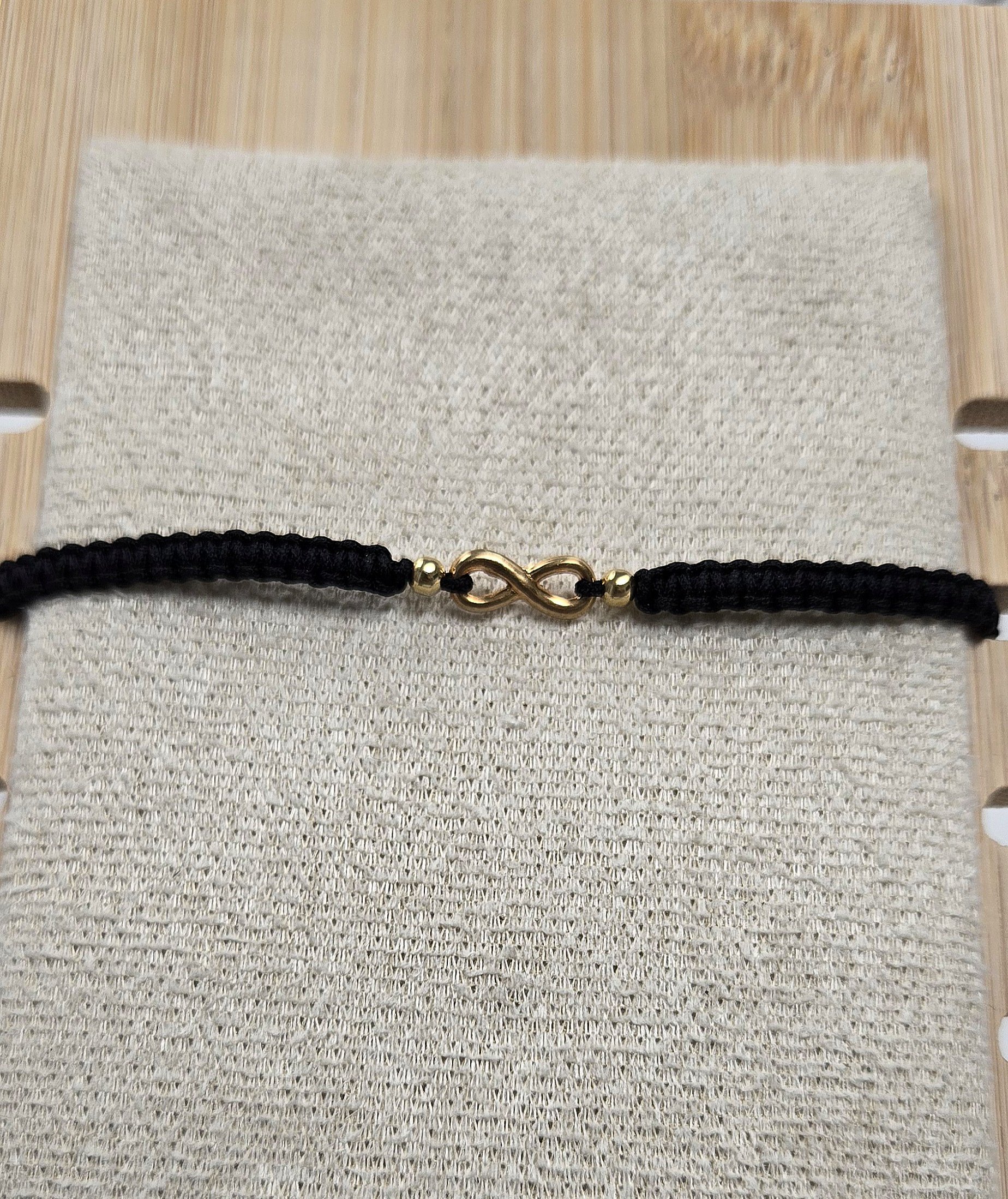 Cadena de oro de 18k, Pulsera ajustable de hilo chino negro con dos balines lisos #3 y herraje de infinito de largo, g de peso.