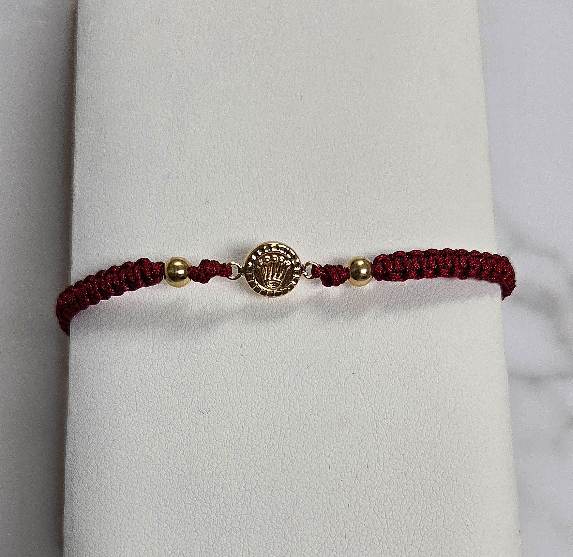Cadena de oro de 18k, Pulsera ajustable de hilo chino rojo con dos balines lisos oro amarillo #3 y herraje de corona rolex de largo, g de peso.